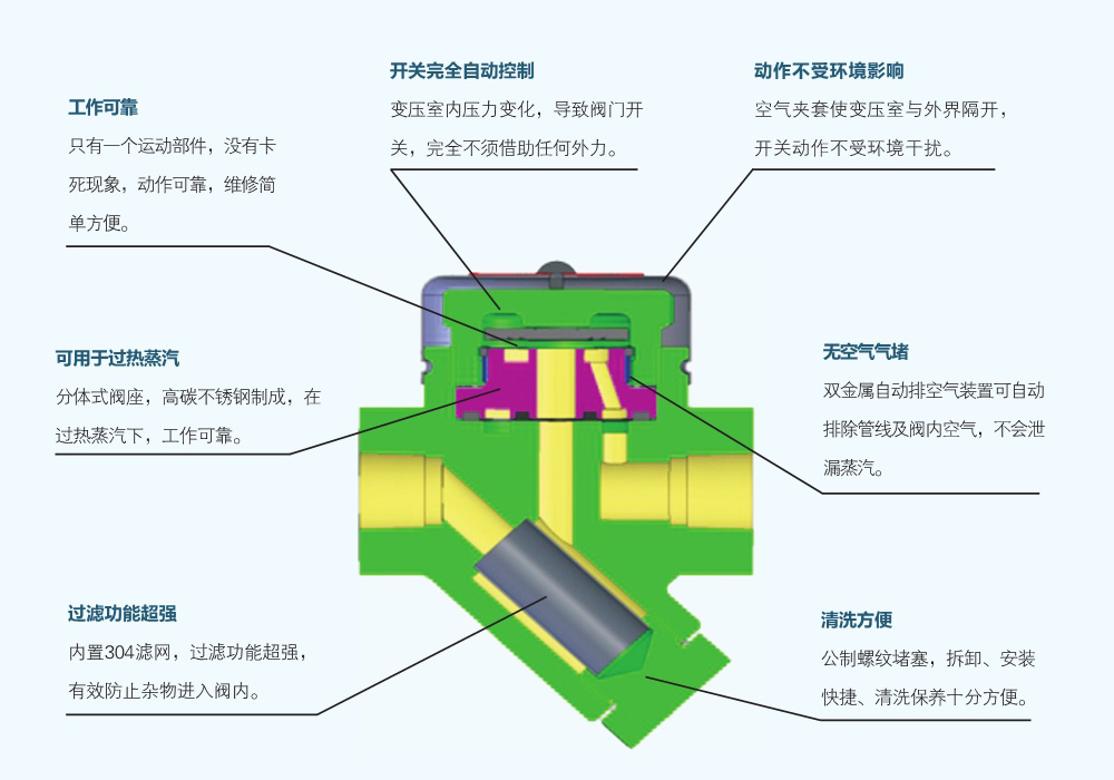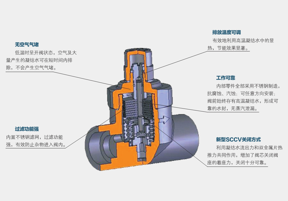 熱靜力型蒸汽疏水閥通常由閥體、閥蓋、彈簧、活塞、密封圈等部件組成,利用熱脹冷縮原理,以及水在高溫下的膨脹速度快于蒸汽的優(yōu)越性,形成疏水閥的工作原理。其中,閥蓋上有一系列壓縮彈簧,彈簧下端與活塞相連,上端與閥蓋相連,當(dāng)工作介質(zhì)中的水位高于設(shè)定值時,水將進(jìn)入閥體,推動活塞上移,壓縮彈簧使閥門關(guān)閉;當(dāng)工作介質(zhì)中的水位低于設(shè)定值時,彈簧推動活塞下移,打開閥門,將水排出。