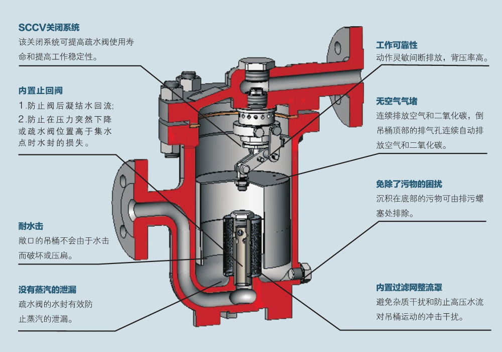 機(jī)械型疏水閥是利用凝結(jié)水與蒸汽的密度差,通過凝結(jié)水液位變化,使浮子升降帶動閥瓣開啟或關(guān)閉,實現(xiàn)阻汽排水功能的疏水閥。機(jī)械型疏水閥的過冷度小,不受工作壓力和溫度變化的影響,有水即排,加熱設(shè)備里不存水,能使加熱設(shè)備顯著提高換熱效率,具有工作性能穩(wěn)定、排水量大、使用壽命長等特點。