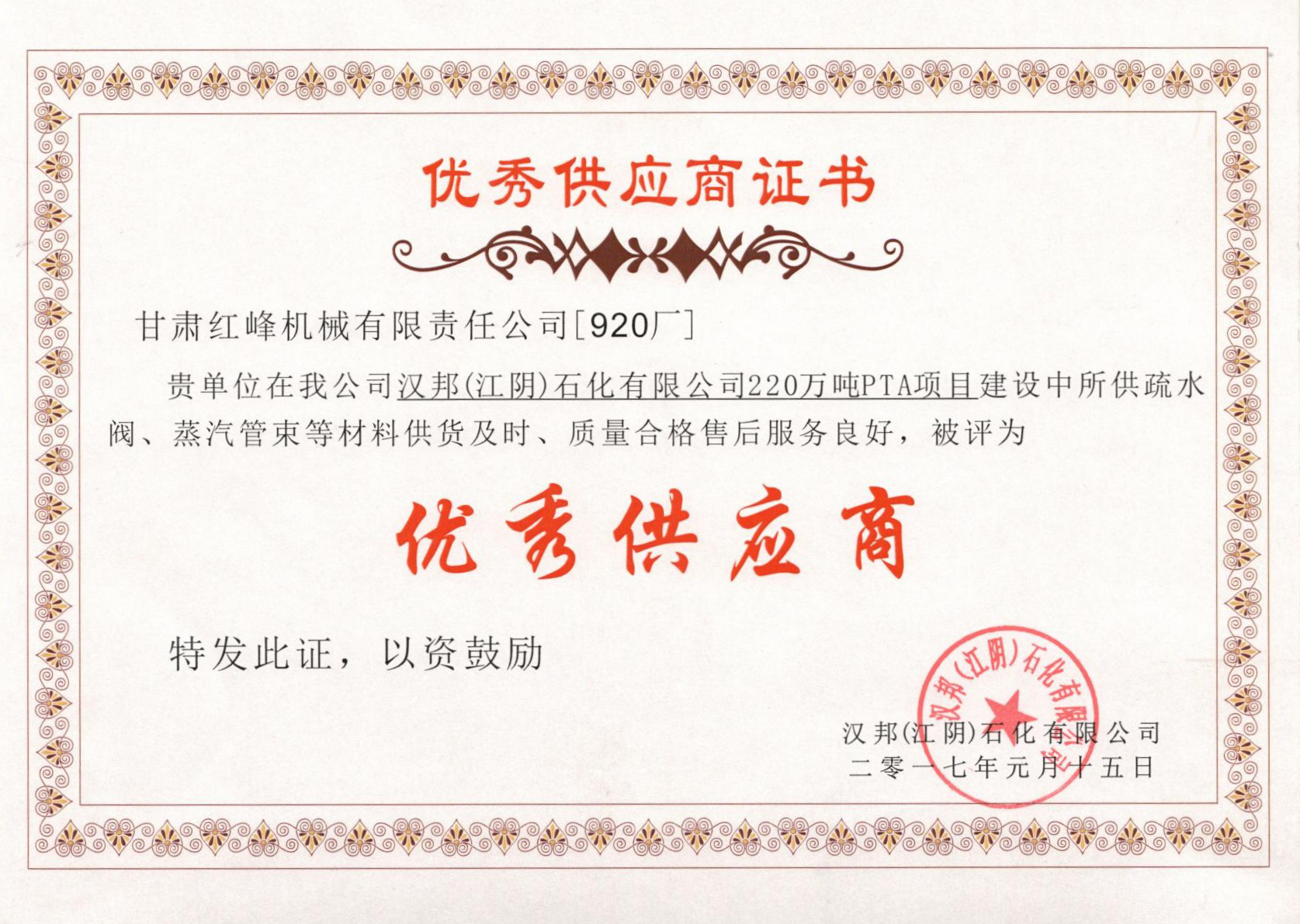 2017年漢邦石化公司優(yōu)秀供應(yīng)商